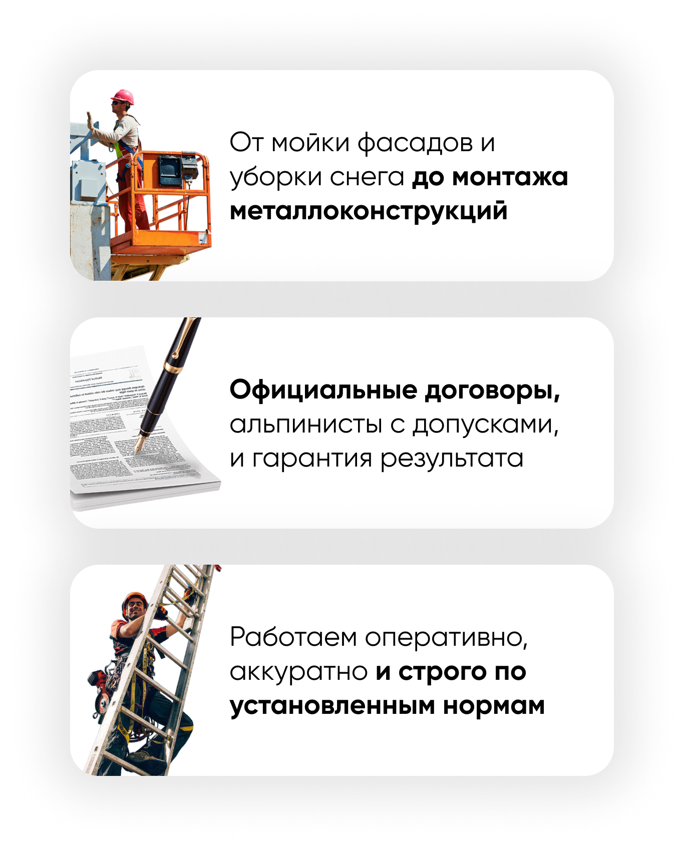Стоимость рассчитывается индивидуально и зависит от вида работ, высоты, объёма и сложности объекта. Для точного расчёта достаточно оставить заявку - мы проведём консультацию и при необходимости выезд на объект.