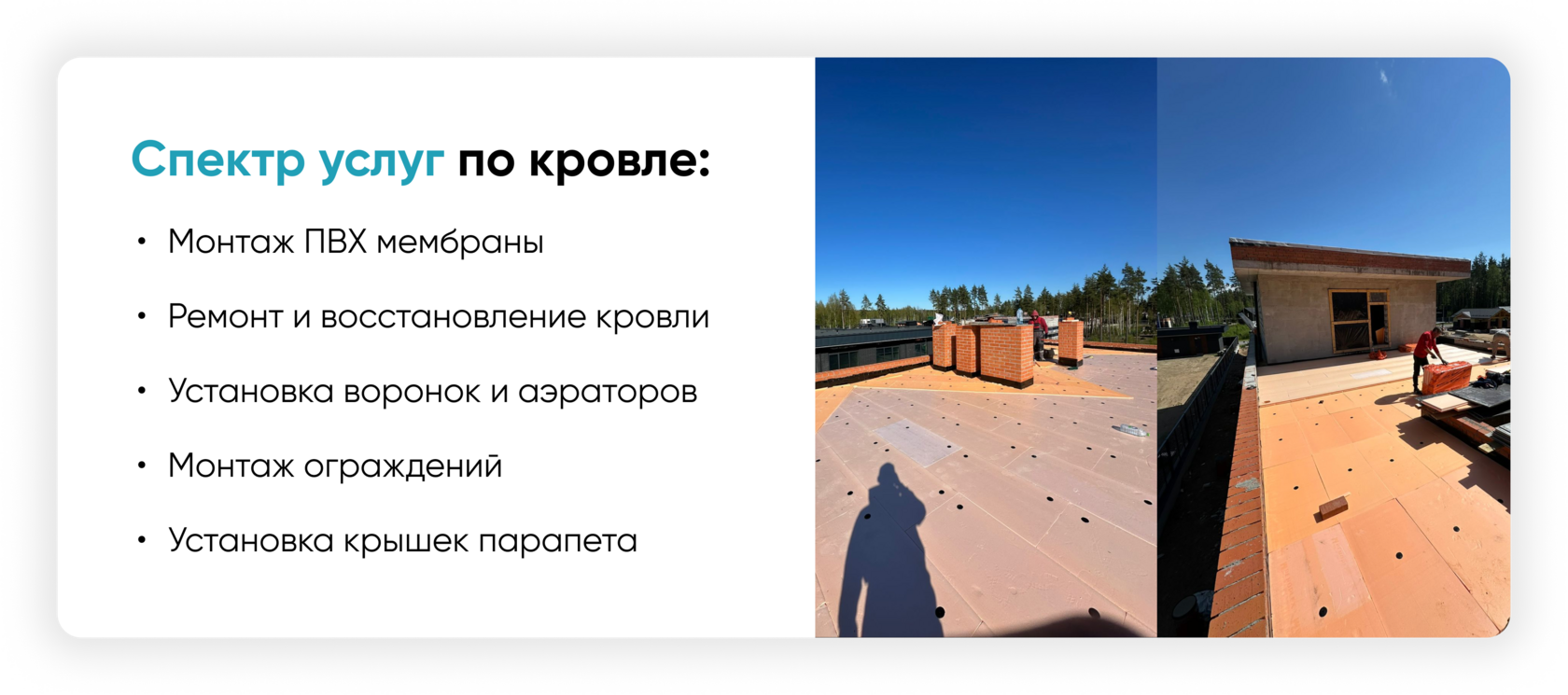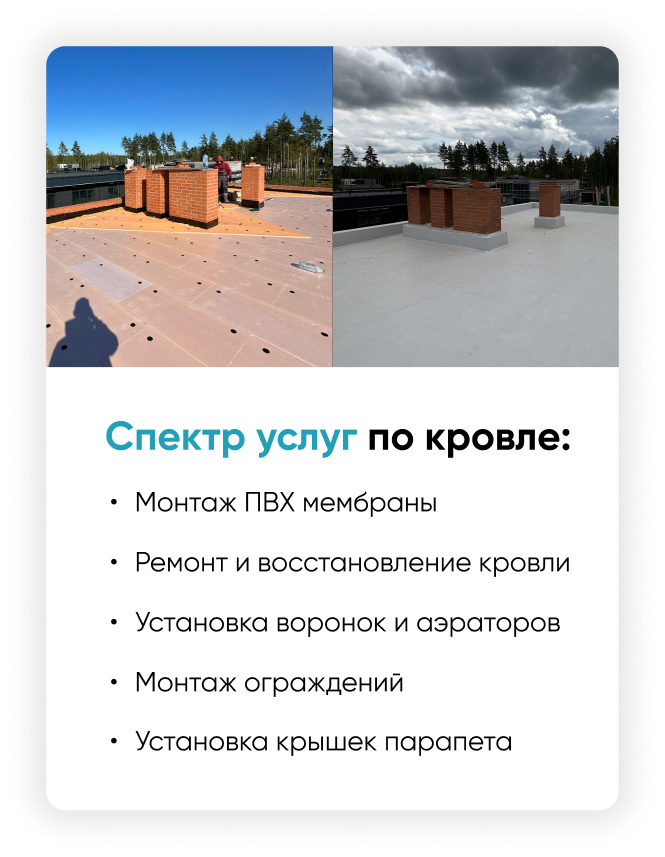 Формируем прозрачный расчёт стоимости и фиксируем условия работ. Монтаж или ремонт выполняется строго по технологии с обязательным контролем всех узлов: швов, примыканий, воронок и парапетов.